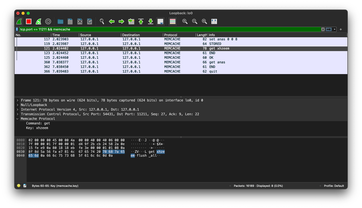 0000 02 00 00 00 45 00 00 4a 00 00 40 00 40 06 00 00 | . . . . . . . . . . . . . . . .0010 7f 00 00 01 7f 00 00 01 d4 9f 2b cb 24 58 2a 0e | . . . . . . . . . . . . . . . .0020 15 fe e9 0a 80 18 18 eb fe 3e 00 00 01 01 08 0a | . . . . . . . . . . . . . . . .0030 8f 8d 5a 56 fa e7 81 4c 67 65 74 20 78 68 7a 65 | . . . . . . . . g e t . x h z e0040 65 6d 0d 0a 66 6c 75 73 68 5f 61 6c 6c 0d 0a | e m . . f l u s h _ a l l . .