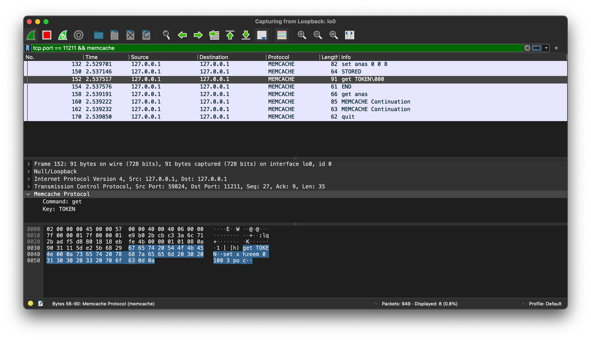 0000 02 00 00 00 45 00 00 57 00 00 40 00 40 06 00 00 | . . . . . . . . . . . . . . . .0010 7f 00 00 01 7f 00 00 01 e9 b0 2b cb c3 3a 6c 71 | . . . . . . . . . . . . . . . .0020 2b ad f5 d8 80 18 18 eb fe 4b 00 00 01 01 08 0a | . . . . . . . . . . . . . . . .0030 90 31 11 5d e2 5b 68 29 67 65 74 20 54 4f 4b 45 | . . . . . . . . g e t . T O K E0040 4e 00 0a 73 65 74 20 78 68 7a 65 65 6d 20 30 20 | N . . s e t . x h z e e m . 0 .0050 31 30 30 20 33 20 70 6f 63 0d 0a | 1 0 0 . 3 . p o c . .